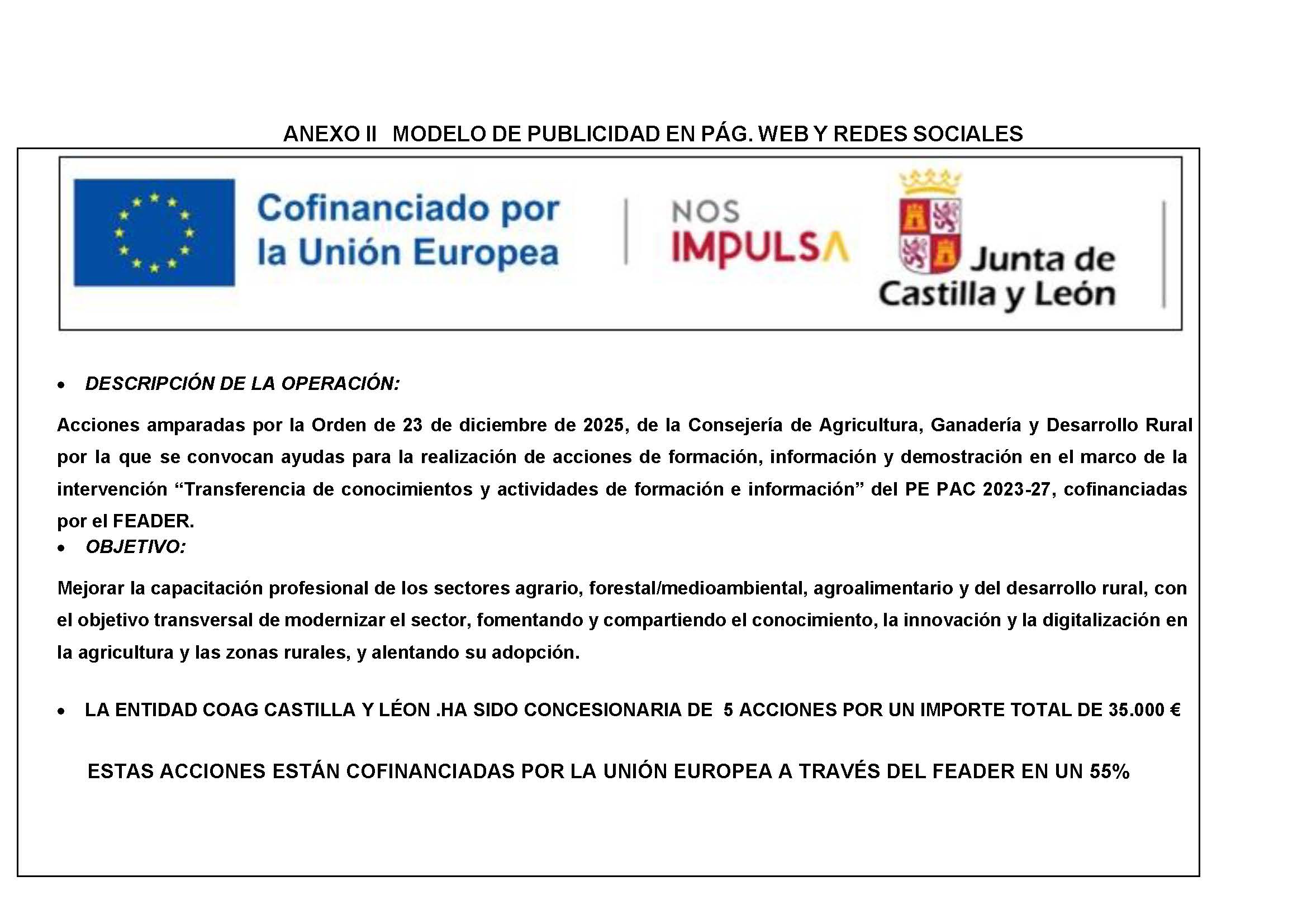 Acciones amparadas por la Orden de 23 de diciembre de 2025, de la Consejería de Agricultura, Ganadería y Desarrollo Rural por la que se convocan ayudas para la realización de acciones de formación, información y demostración en el marco de la intervención “Transferencia de conocimientos y actividades de formación e información” del PE PAC 2023-27, cofinanciadas por el FEADER.