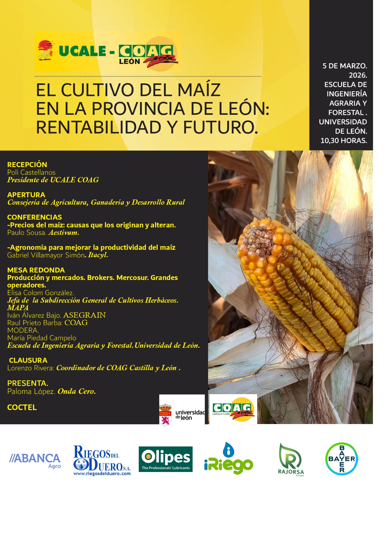 UCALE-COAG LEÓN y COAG CASTILLA Y LEÓN, con la colaboración de la UNIVERSIDAD DE LEÓN y el apoyo de ABANCA Agro, RIEGOS DEL DUERO, OLIPES, I-RIEGO, RAJORSA-Soaga y BAYER organizan una interesante Jornada para debatir sobre la producción de maíz en la provincia leonesa, analizar los factores que condicionan se rentabilidad y las perspectivas de futuro del cultivo. Con la participación de importantes expertos en cada uno de los temas que abordarán (ver programa abajo).