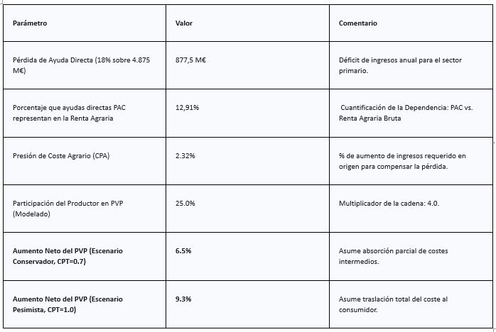 El ajuste presupuestario proyectado a partir de 2028 implica una pérdida directa de 877,5 millones de euros en rentas agrarias. Para compensar ese déficit, los productores se verían obligados a repercutir un incremento del 2,32% en los precios en origen, según los cálculos realizados por los servicios técnicos de COAG.